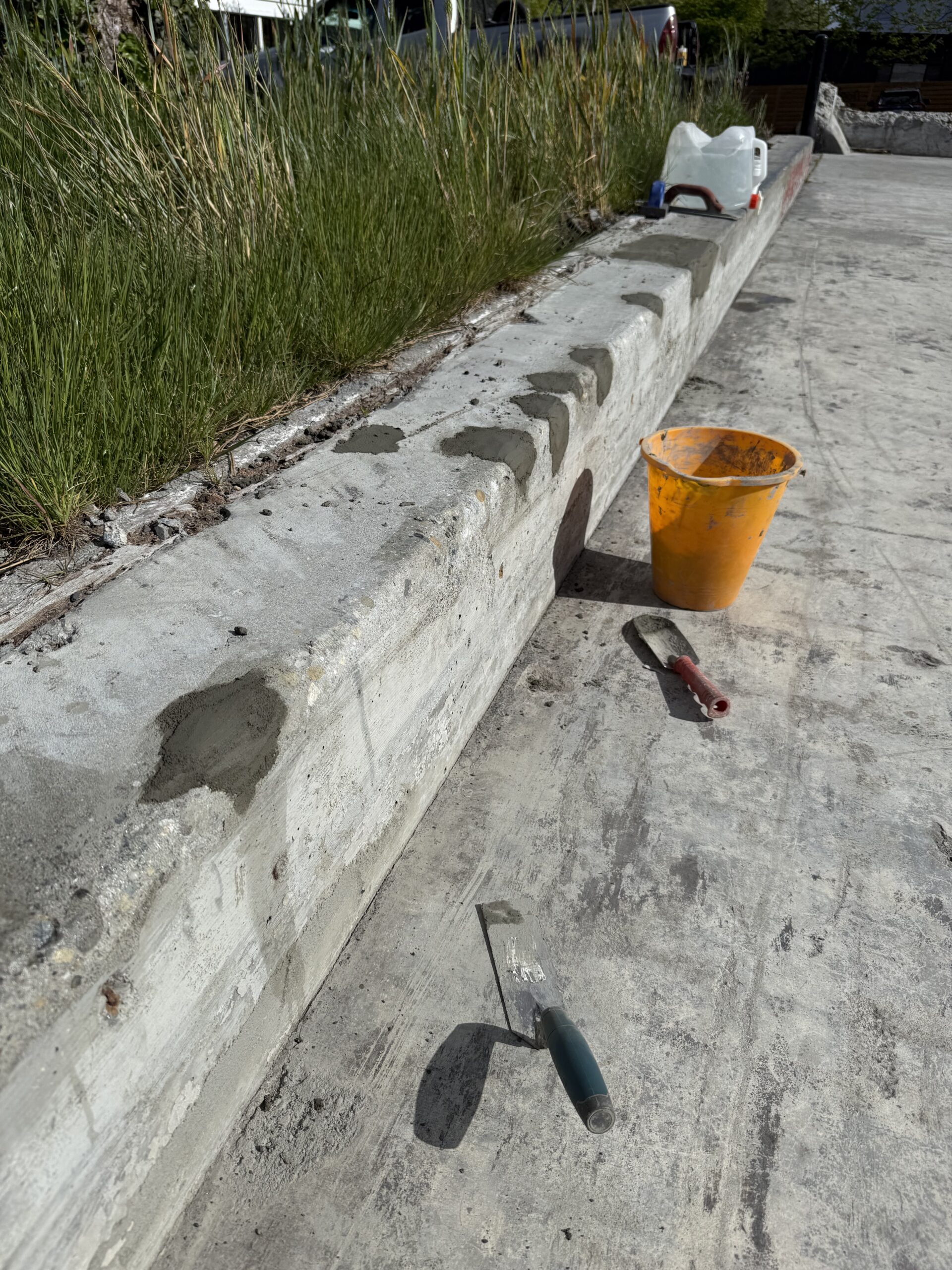 We parked, hopped out, and immediately realized the slab was insanely smooth, since it was originally the inside of a building. It was like perfect perfect. But it was also pretty disgusting. Trash everywhere, needles, rubble, fire debris, random junk piled in every corner. We grabbed our brooms and started sweeping, blowing, scraping and cleaning as best we could. Once we cleared enough of the surface to see what was really there, we noticed on the street side there was a twelve inch tall foundation wall running the length of the east side, and it could maybe be made skateable. It was beat up from the fire and demolition, but maybe fixable? So we just started. No plan, no big idea, just doing what we always do; find a new spot, try to fix it up to skate it, and if we’re lucky maybe get a clip. Over the next few days we all just kept showing up, cleaning, hauling out bag after bag of trash. We ended up with dozens of bags of trash and moving wheelbarrows full of rubble, bricks and dirt. Eventually the slab was clean enough to skate. We patched the chunks of ledge, grinded it down with grinders, and steel sticked it into shape. Then we sealed it and waxed it. It wasn’t great, but it worked!