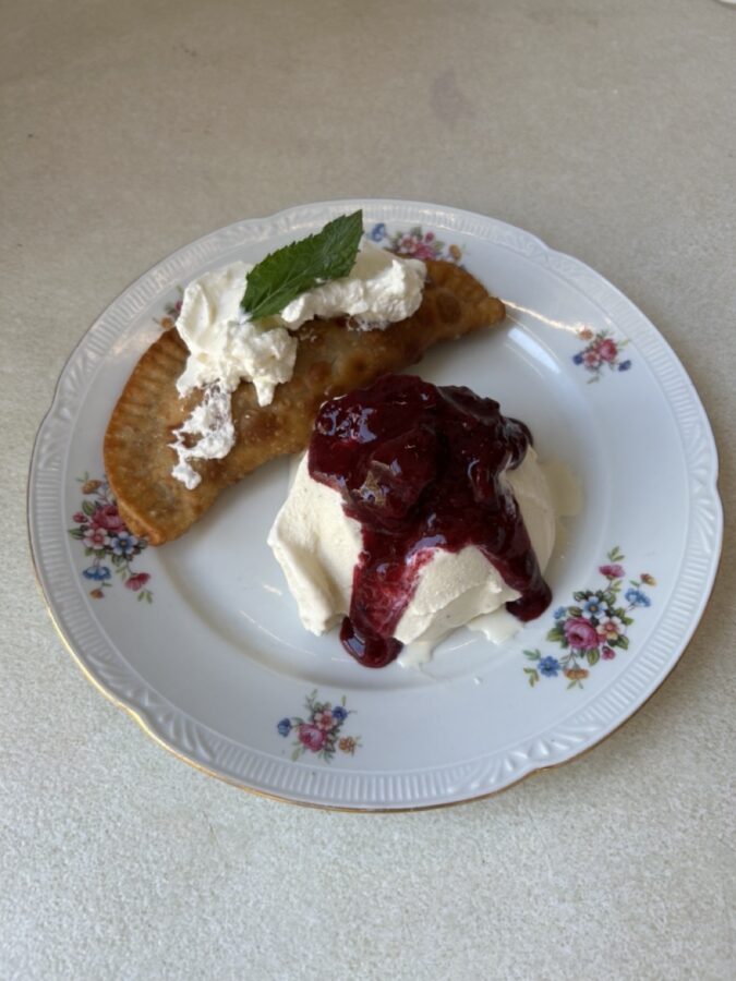 -Your empanada should be drying off on a plate or bowl with paper towels to absorb the outside oil. Place the whipped cream on top of the empanada and single mint leaf on top of the whipped cream.